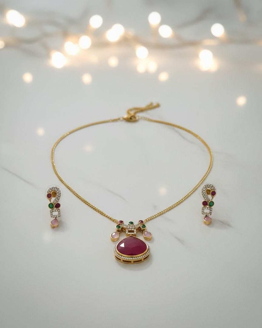The Mrssunshine Royal Ruby Bloom Pendant Set is a graceful blend of royal charm and delicate craftsmanship. Featuring a rich ruby-toned centre stone framed by fine gold detailing, the pendant is beautifully accented with subtle hints of green and soft pink stones, creating a floral bloom-inspired design. Paired with a sleek gold-toned chain and perfectly matching earrings, this set radiates understated luxury. Lightweight yet striking, it is ideal for festive occasions, weddings, and elegant daywear, adding a refined pop of colour and timeless sophistication to your look.